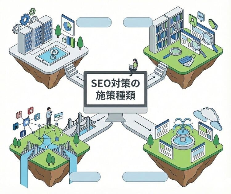 それでは具体的にSEOでは何をおこなうのか、基本となる施策を外部施策・内部施策・テクニカルSEO・コンテンツSEOの4種類にわけて紹介します。